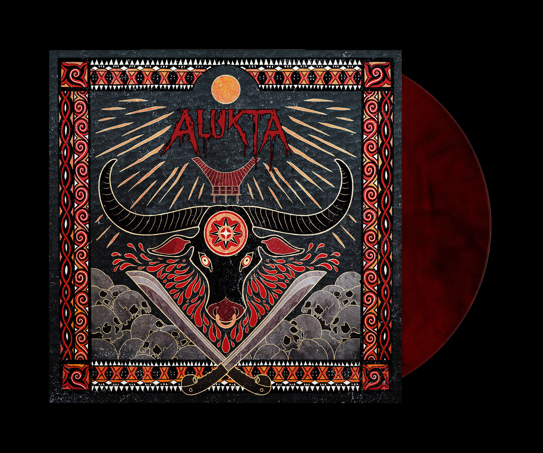 Capa de álbum de vinil com touro estilizado, caveiras e sabres, texto ALUKTA.