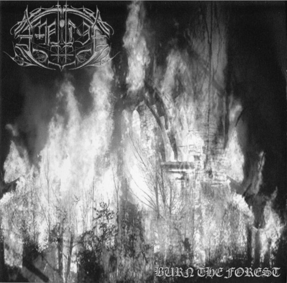 Capa de álbum musical com floresta e igreja em chamas, texto BURN THE FOREST