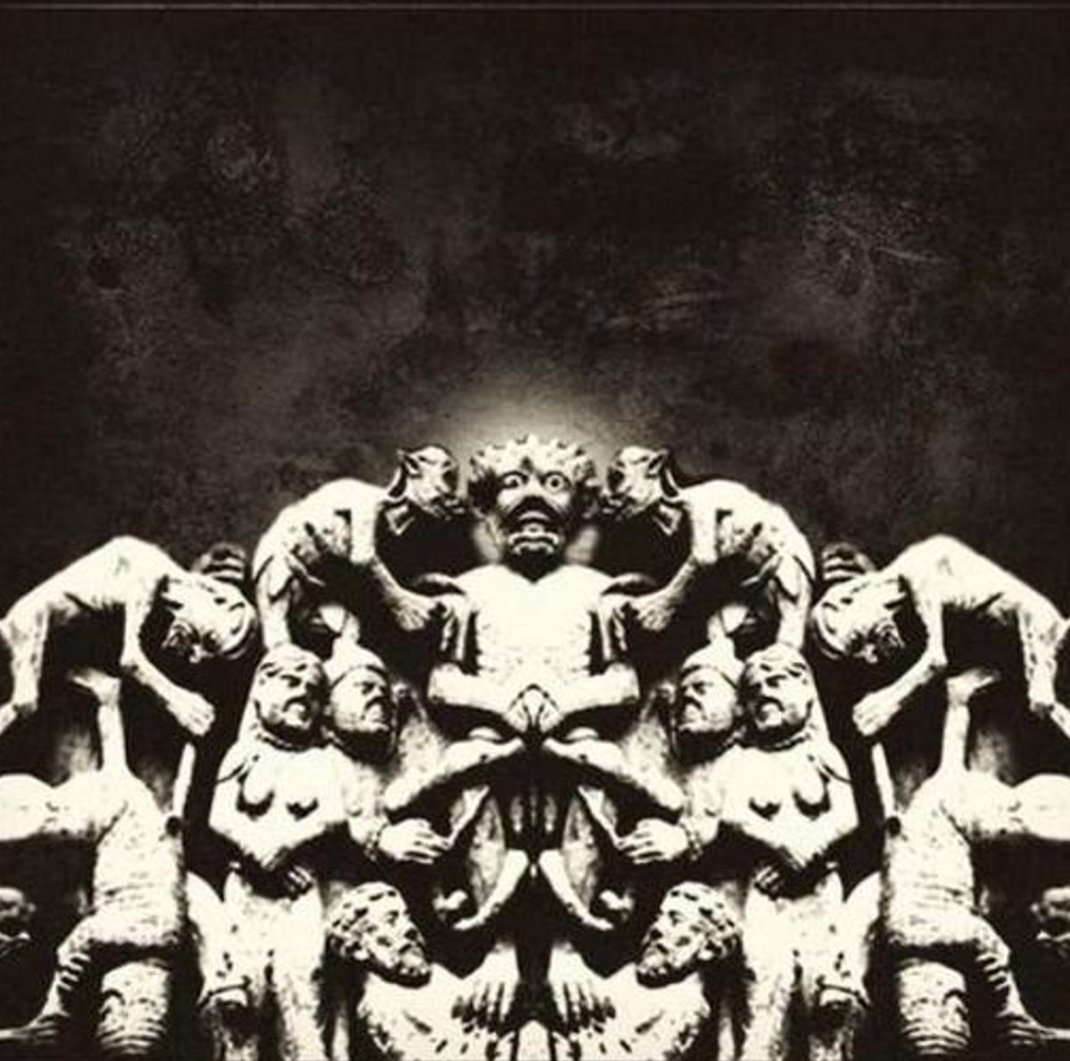 Escultura antiga em pedra com várias figuras humanas e criaturas em fundo escuro