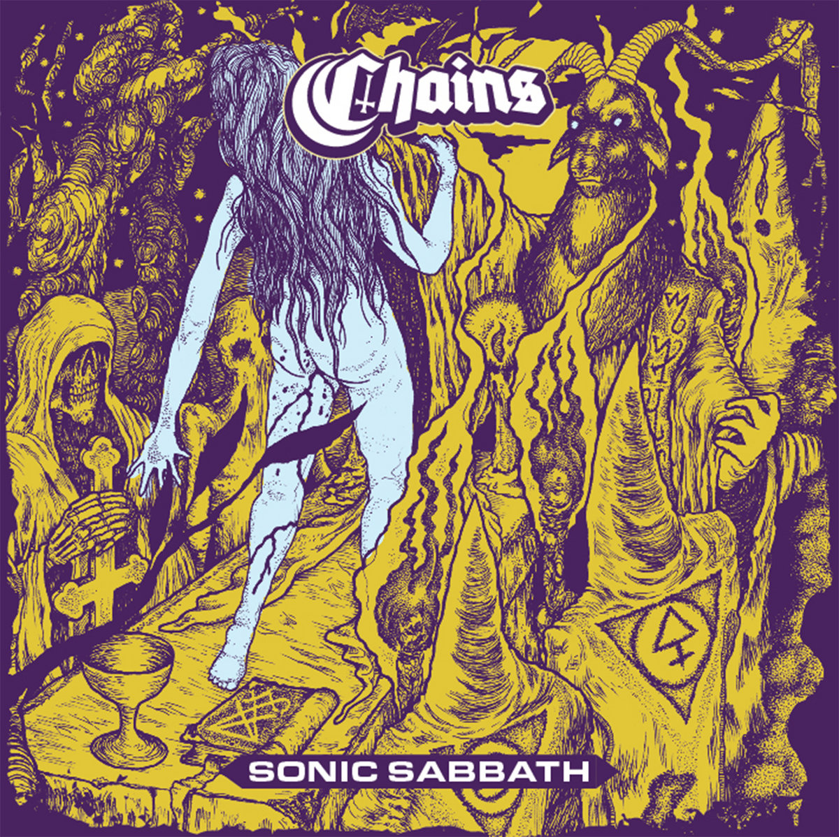 Capa de álbum roxa e amarela com figuras e símbolos ocultos, texto Chains e SONIC SABBATH