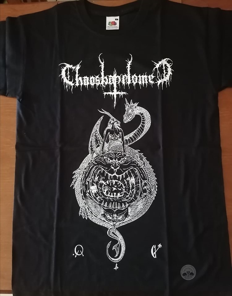 Camisola preta com estampas brancas de dragão e símbolo demoníaco
