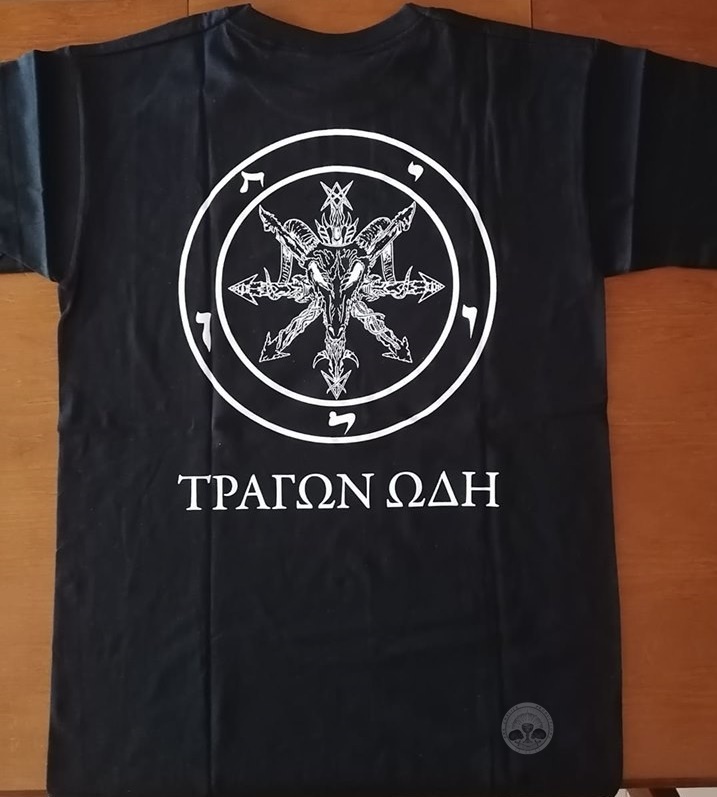 T-shirt preta com estampa branca de símbolos e texto em grego