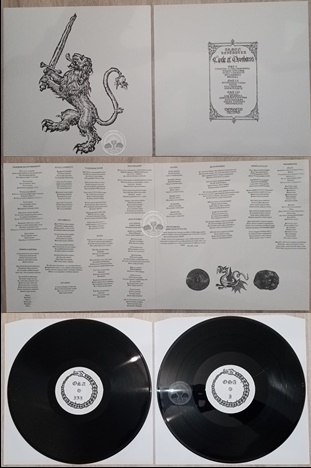 Álbum de vinil com capa ilustrada de leão, encarte com texto e duas vinis pretas lado A e B
