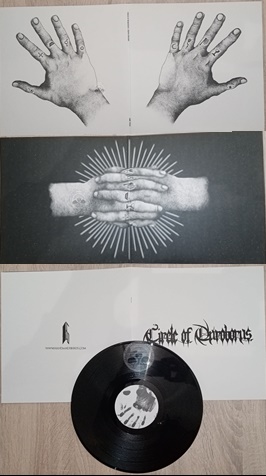Vinil preto com etiqueta de mão, capa com texto Circle of Shadows, ilustrações de mãos em preto e branco