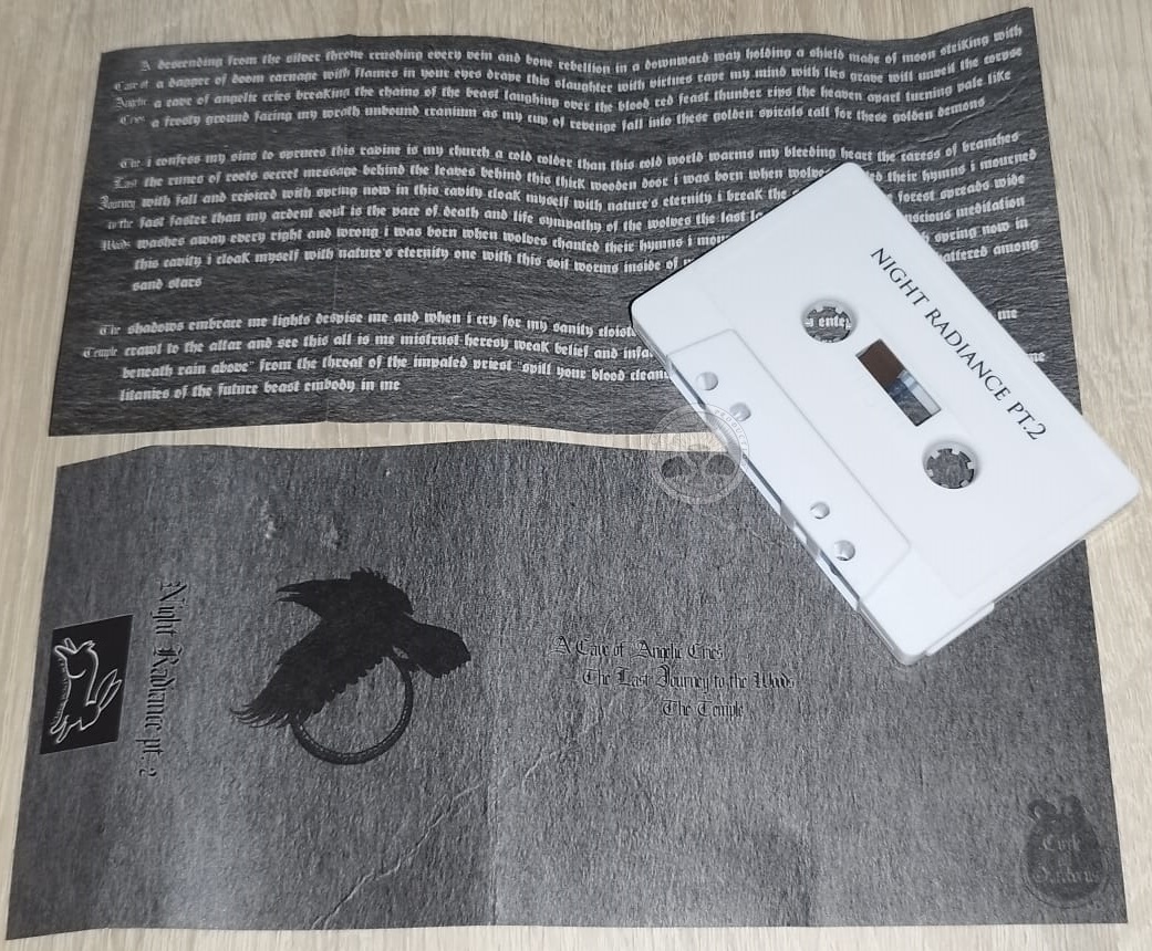 cassete de áudio branca com texto Night Radiance TT2 sobre fundo cinzento com imagem de pássaro e texto