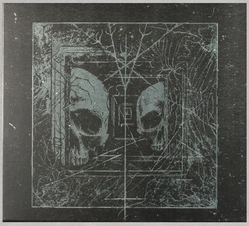 Superfície quadrada preta com desenho de duas caveiras espelhadas e texturas de teias e rachaduras