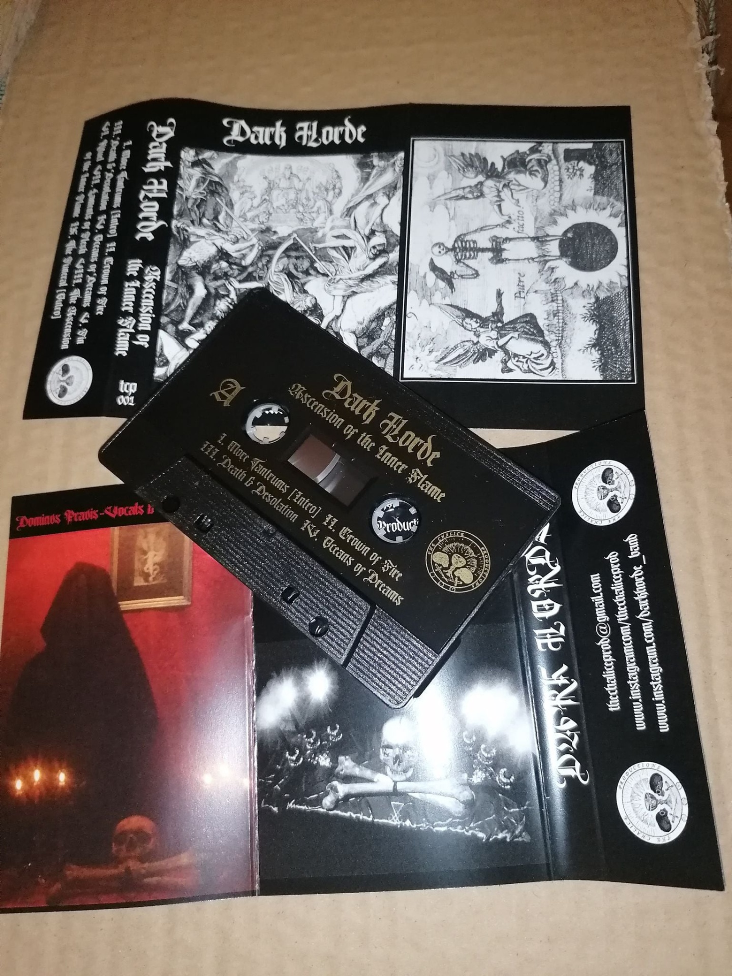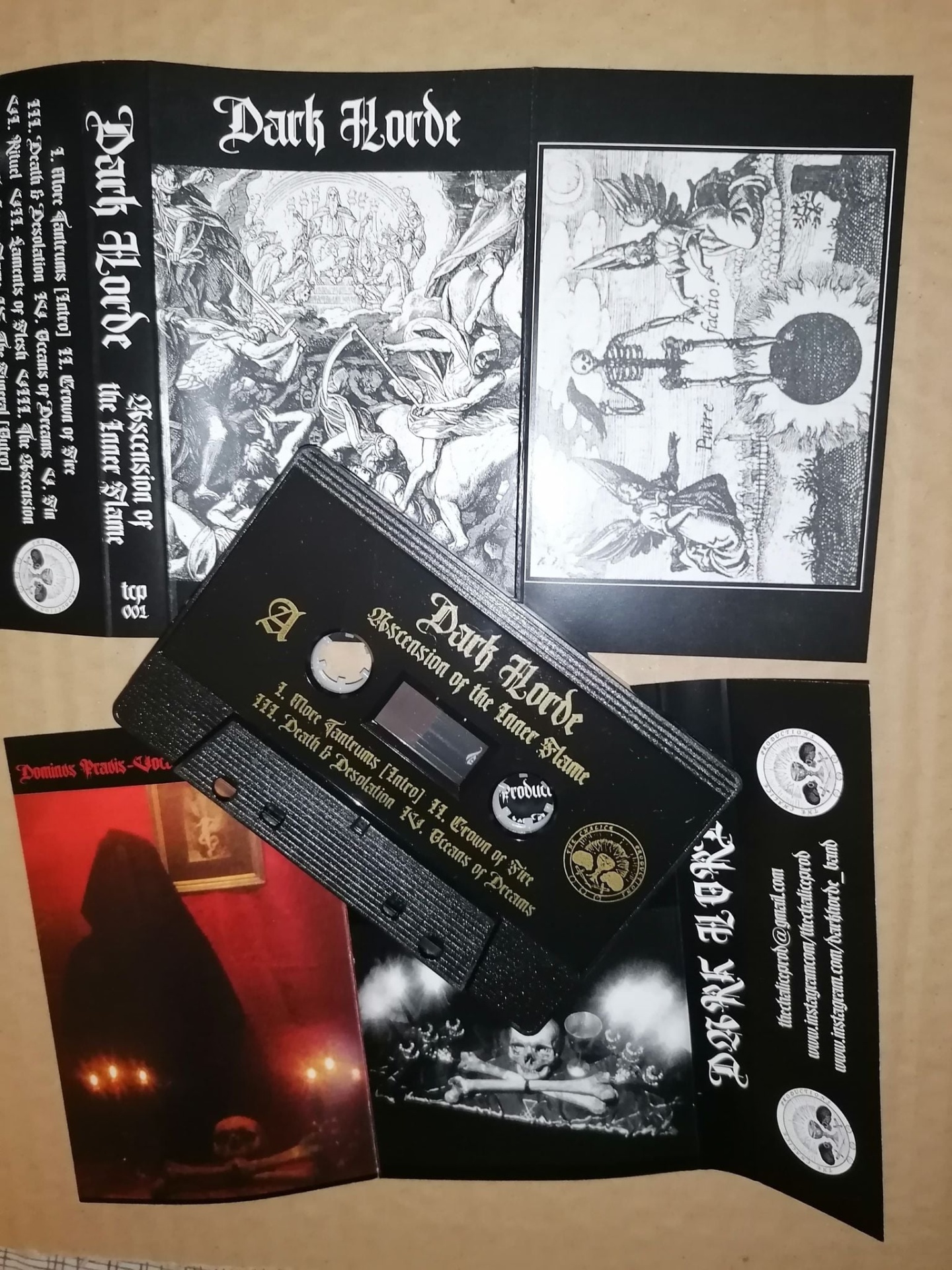 Cassete musical Dark Horde com capa e folhetos em tons pretos e brancos com imagens sombrias