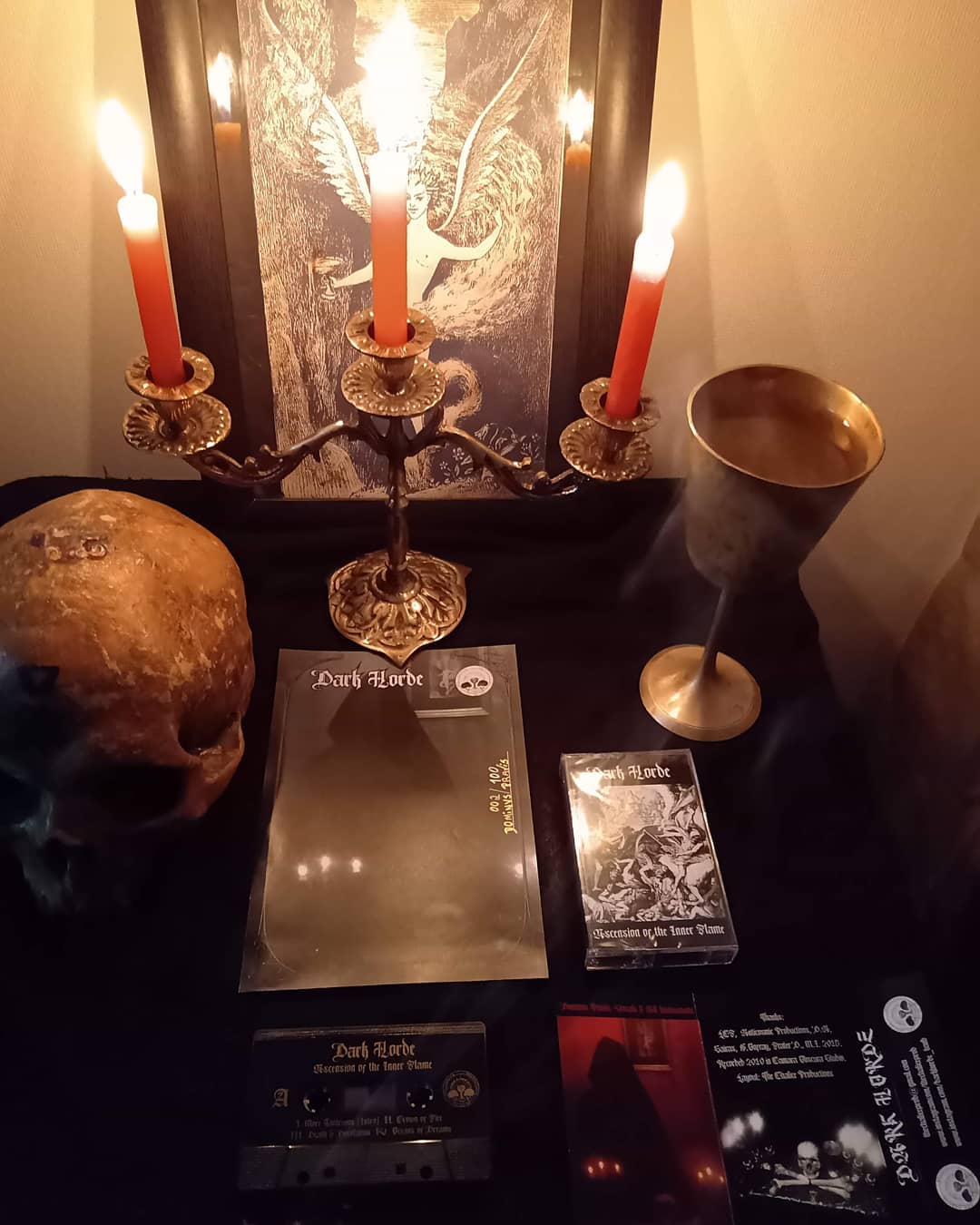 Composição gótica com castiçal, crânio, cálice e material Dark Horde
