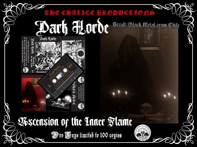 Promoção de cassete Dark Horde com tema occult black metal e figura encapuzada com velas