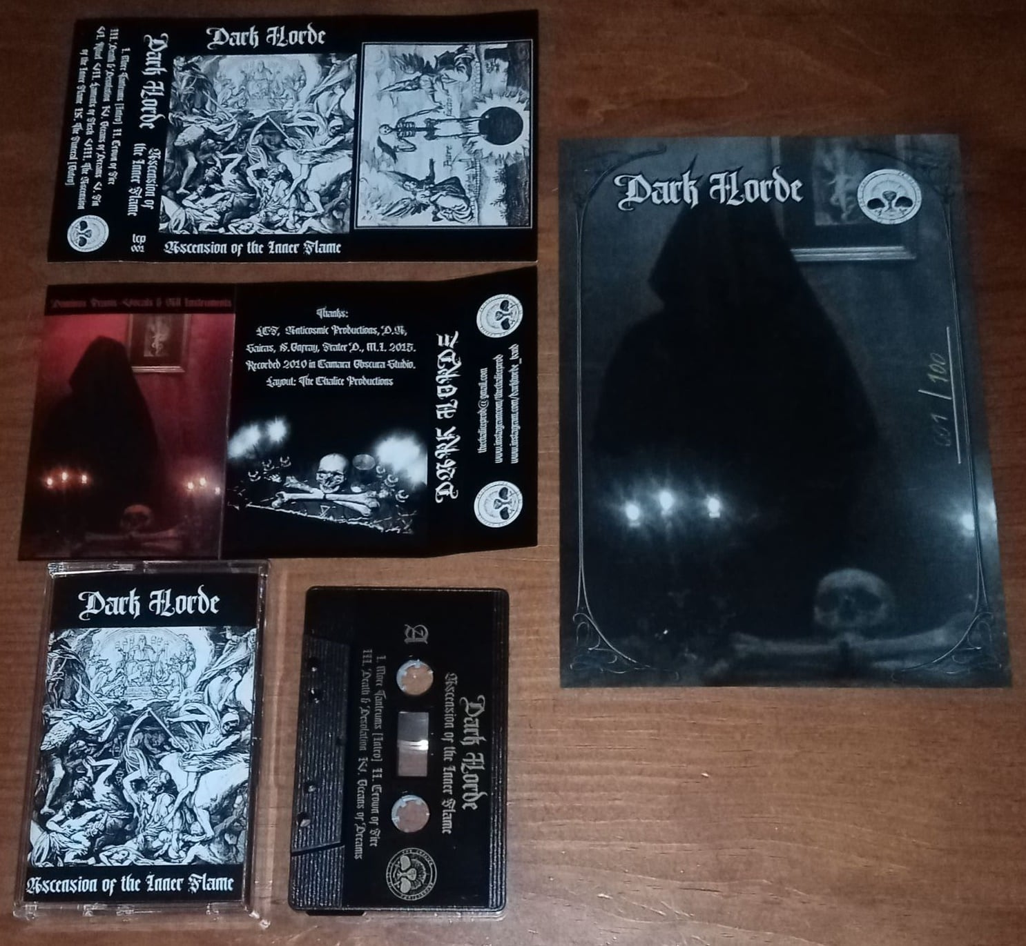 Coleção de fitas cassete e capas de álbuns Dark Horde sobre mesa de madeira