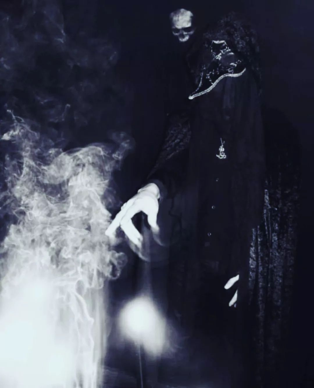 Figura fantasmagórica com capa preta longa e mão branca estendida em ambiente com névoa