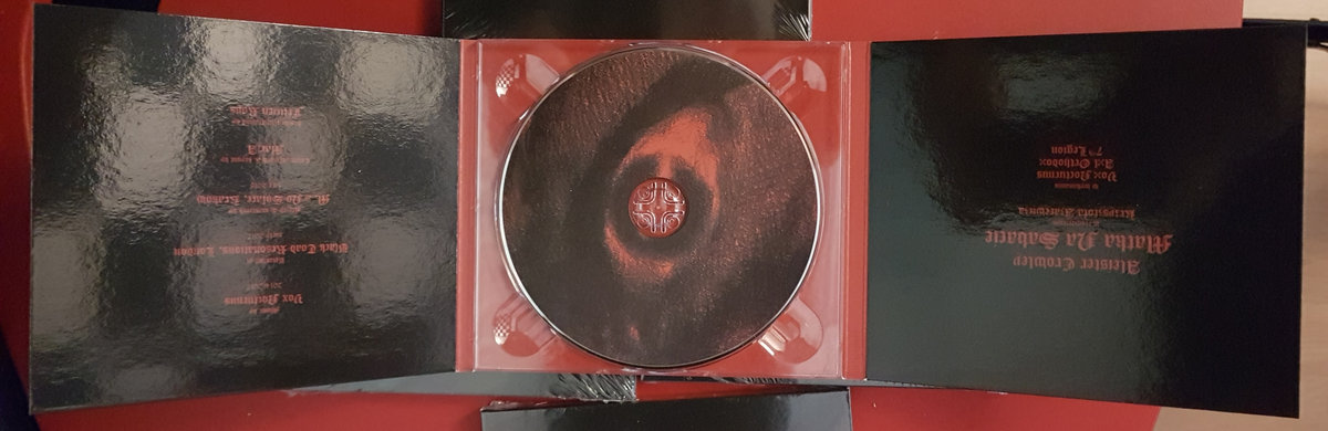 CD musical aberto com capa preta, texto vermelho e disco com padrão texturizado castanho e vermelho