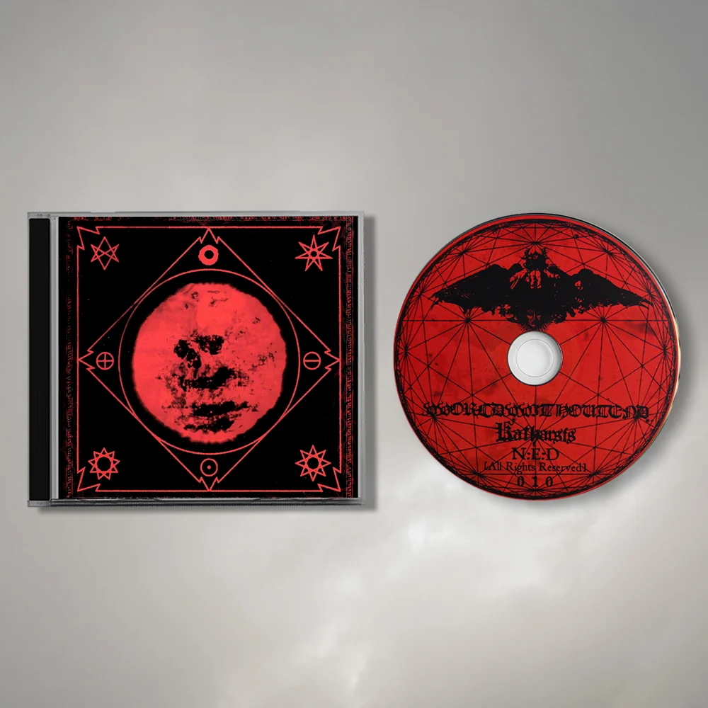 CD com capa preta e vermelha contendo marcas místicas e disco com desenho preto e vermelho