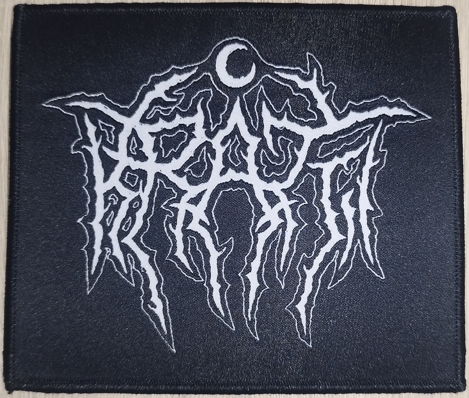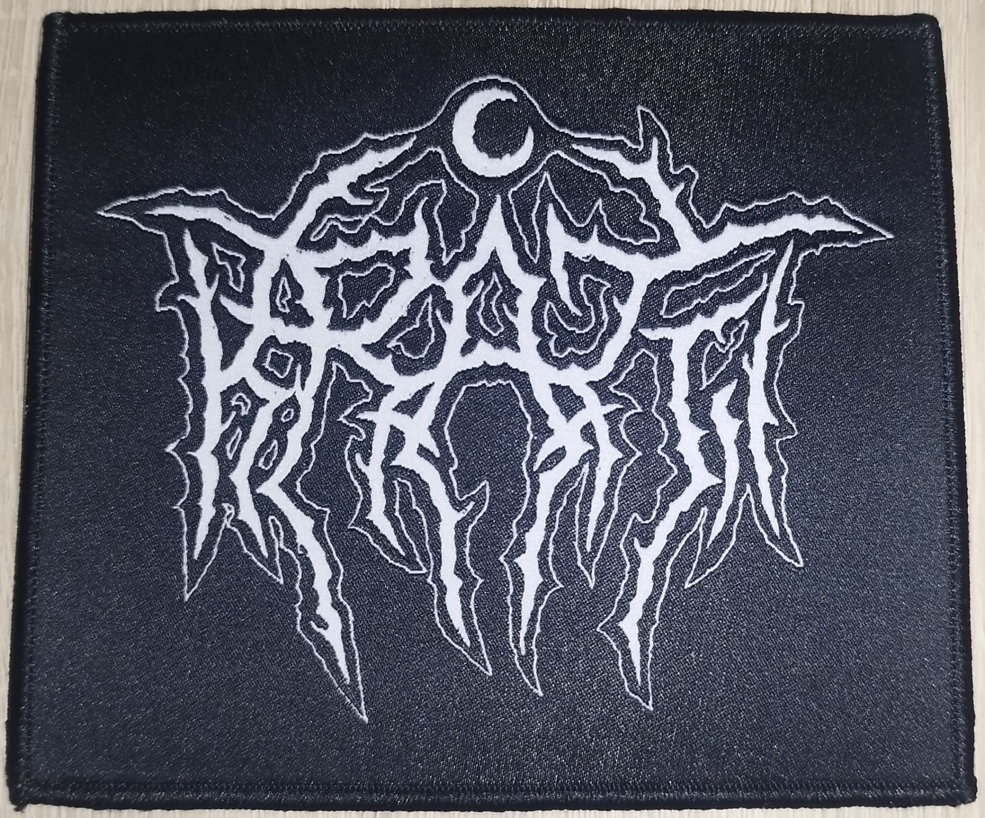 Patch bordado preto com logotipo branco estilizado e lua crescente