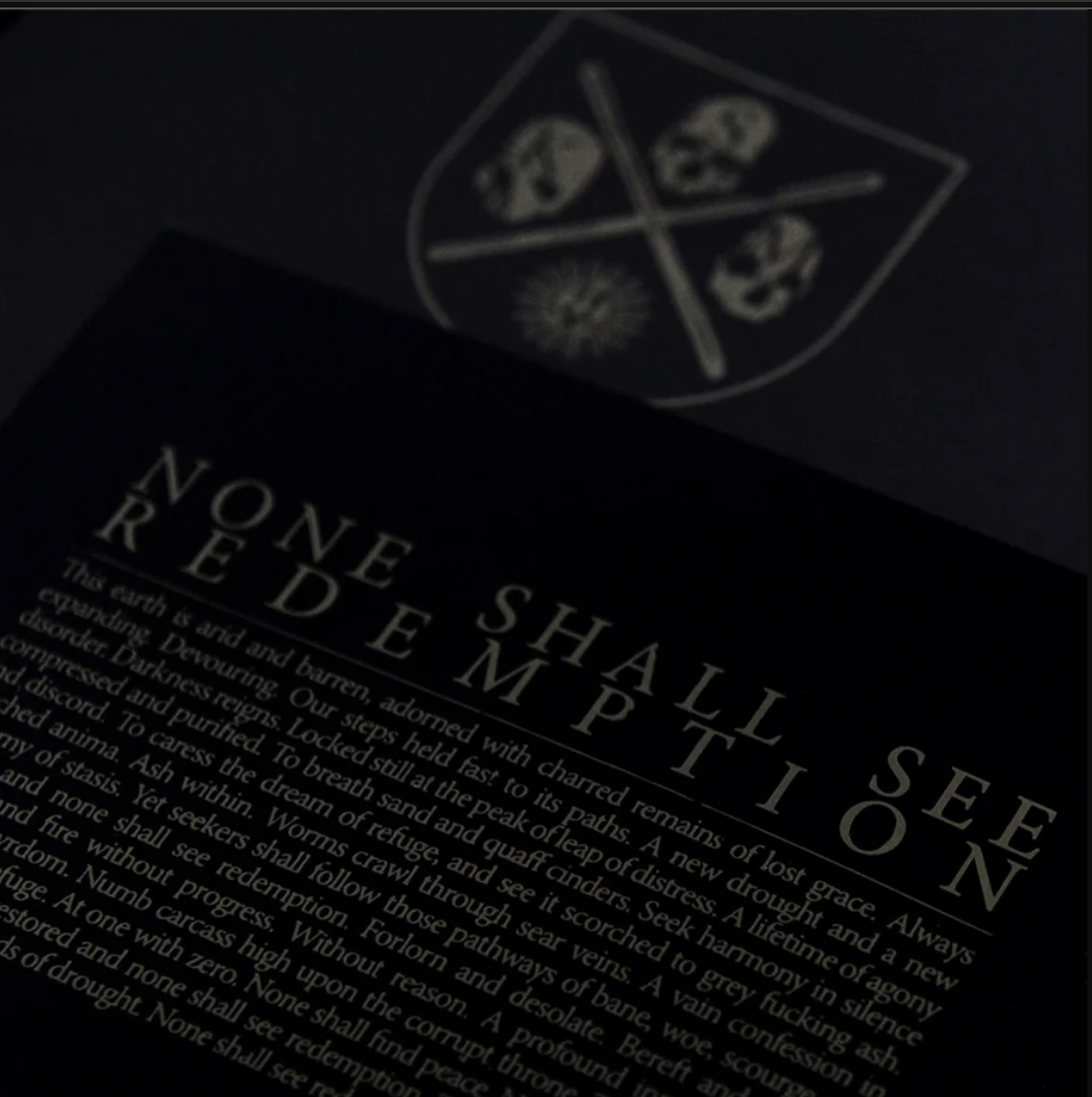 Página preta com texto branco e símbolo de escudo com crânios e sol