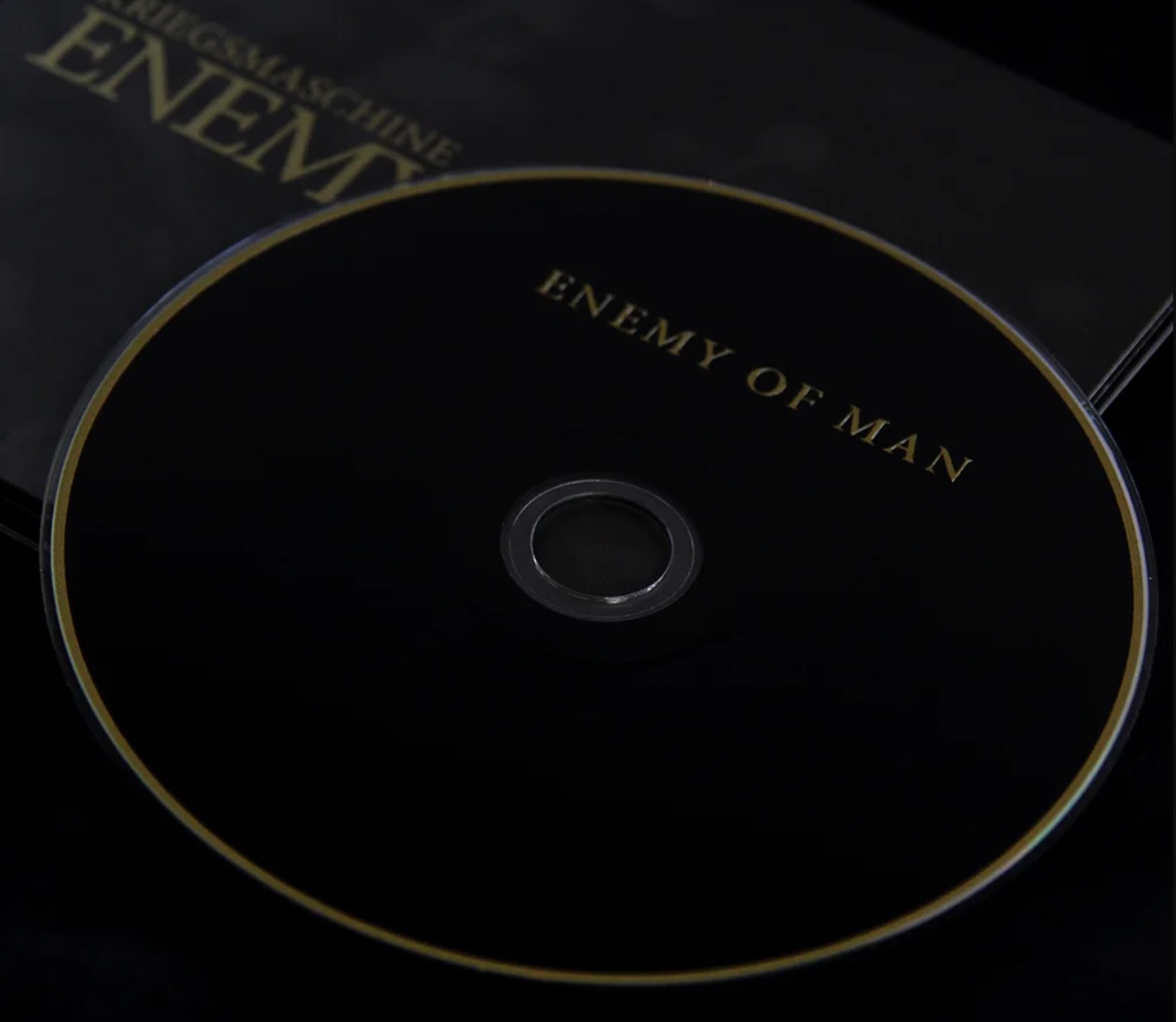 CD preto com texto dourado 'ENEMY OF MAN'