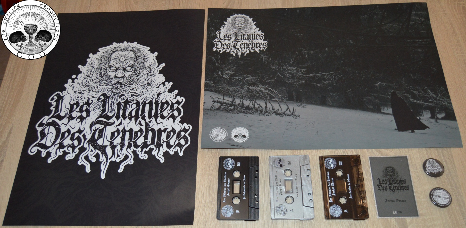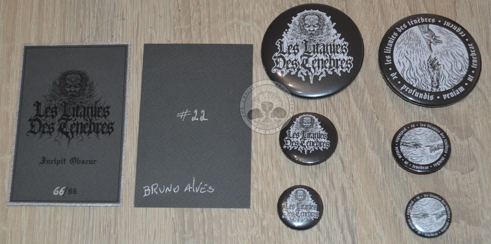 Cartões cinza escuro com texto e vários bottons pretos e brancos com ilustrações e texto Les Litanies Des Tenebres sobre superfície de madeira clara.