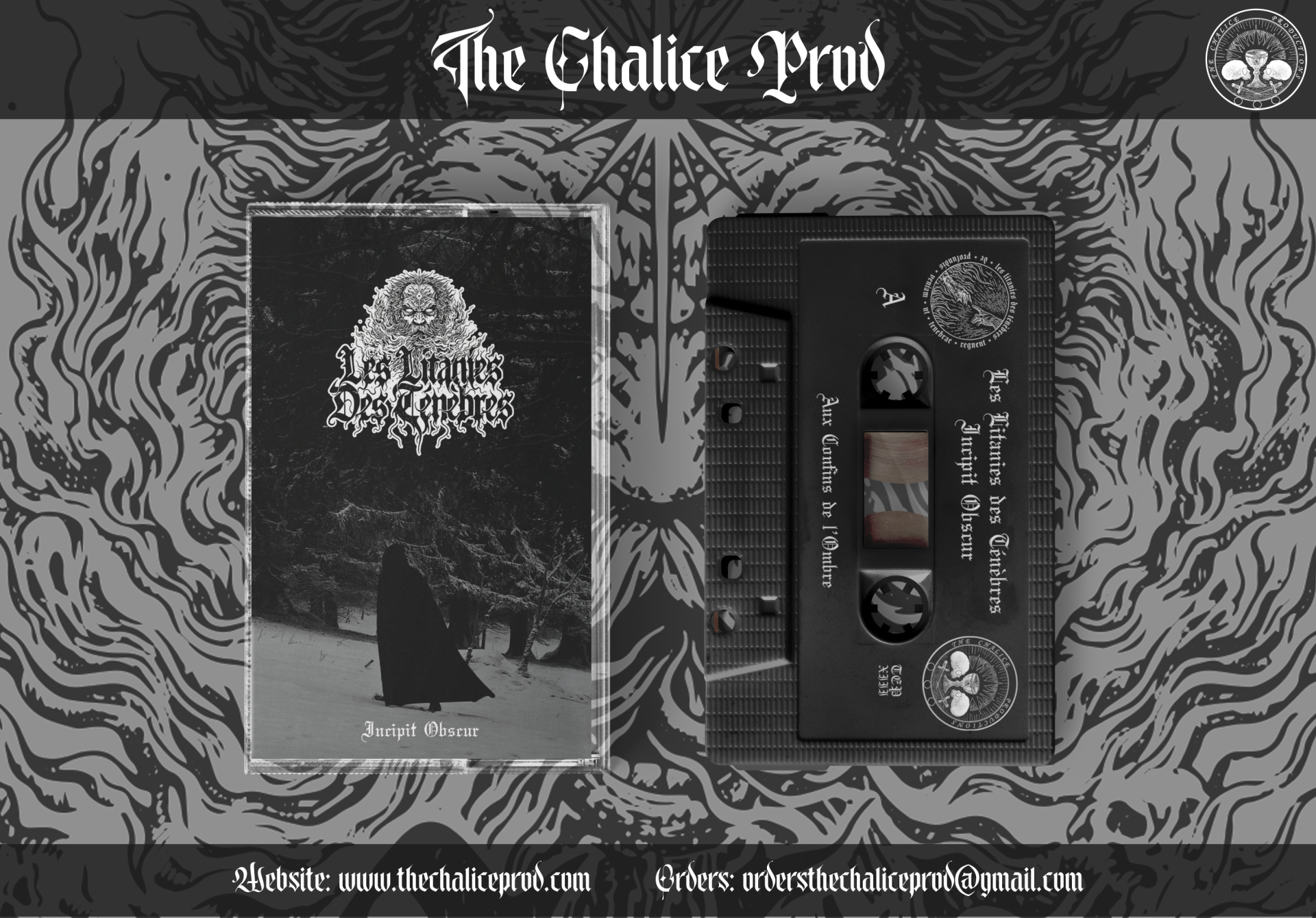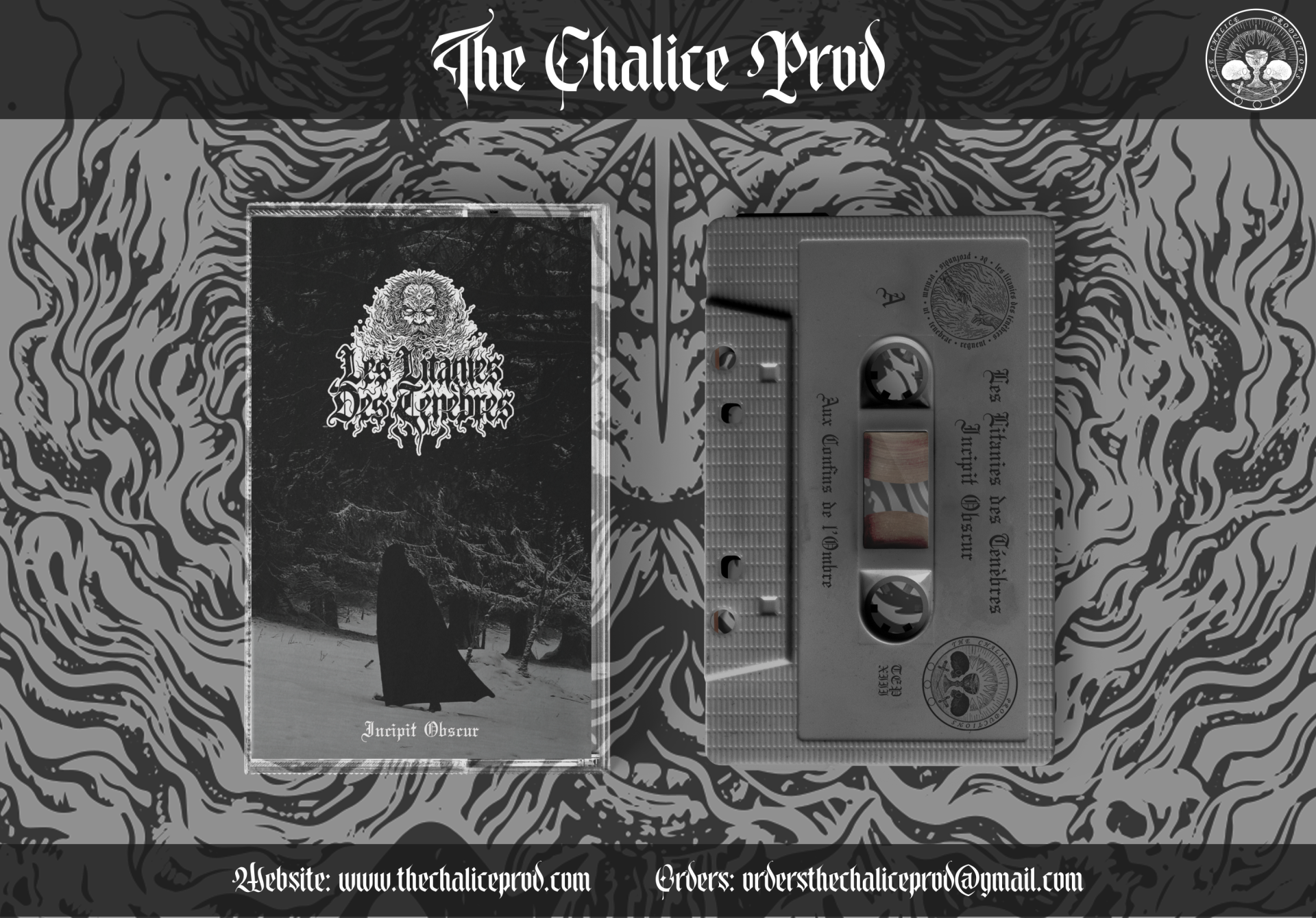 Capa e cassete de áudio do álbum 'Les Litanies Des Tenebres' em preto e branco com arte gótica