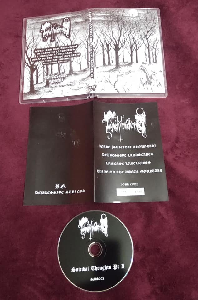 CD e capa preta e branca com ilustrações de árvores e texto Suicidal Thoughts Pt 3