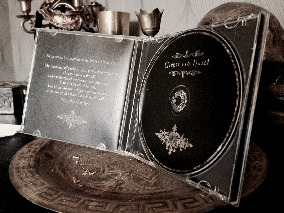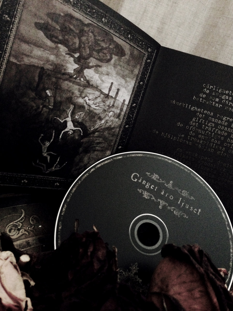 CD com design gótico num estojo aberto com livreto e flores secas ao redor