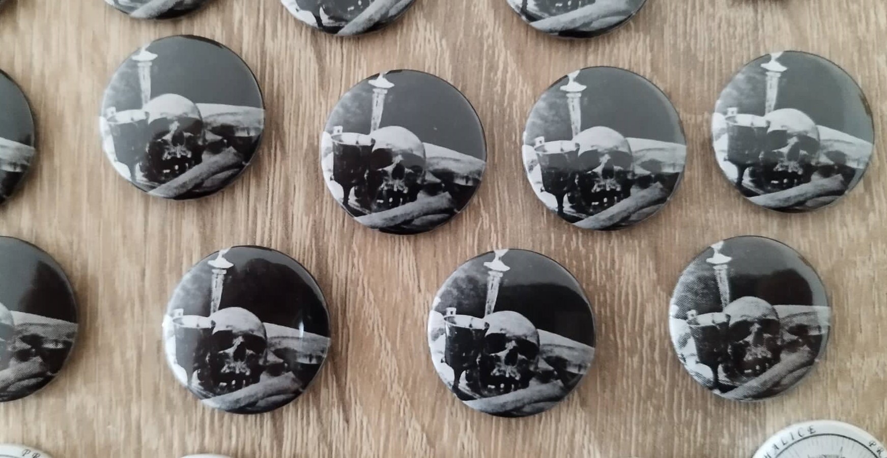 Botons redondos a preto e branco com imagem de pessoas
