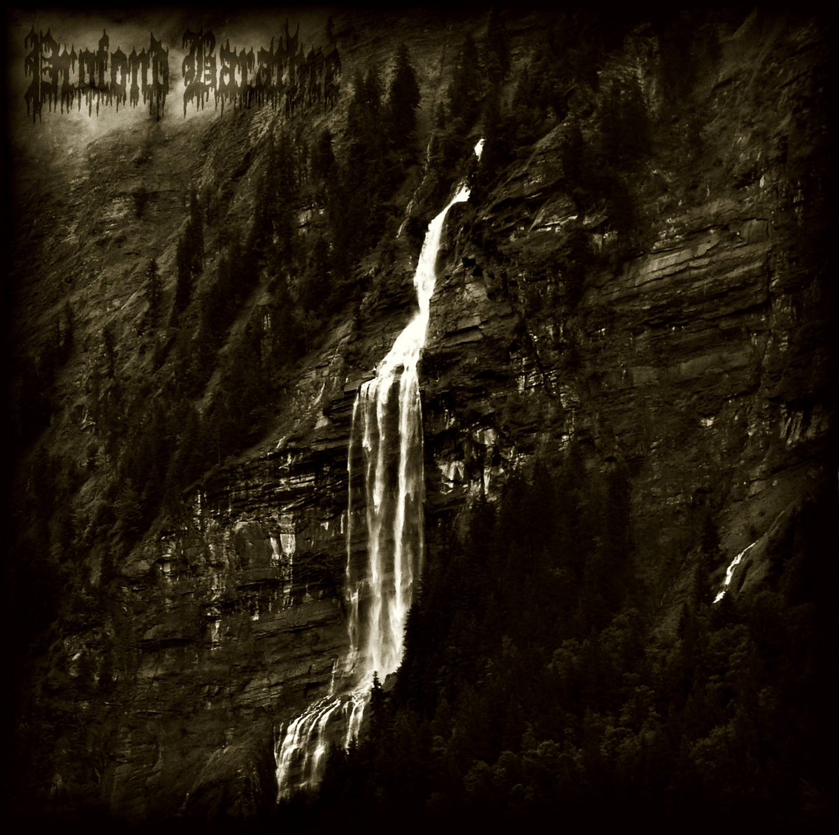 Cascata em penhascos rochosos em tons sépia com texto estilizado no canto superior esquerdo