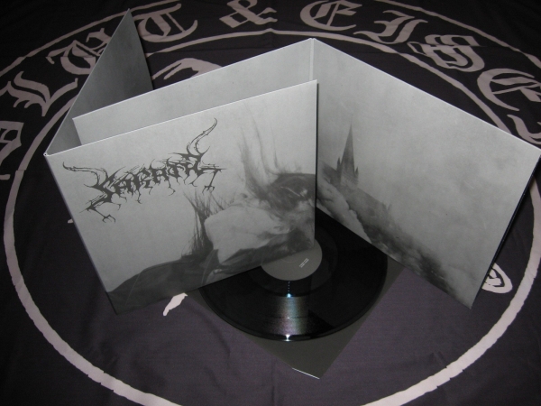 Álbum de vinil preto com capa cinza, fundo preto com texto circular branco.