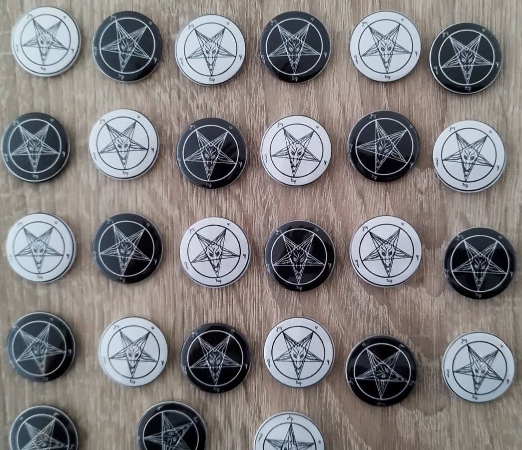 Bottons redondos preto e branco com pentagrama e cabeça de bode sobre superfície de madeira clara