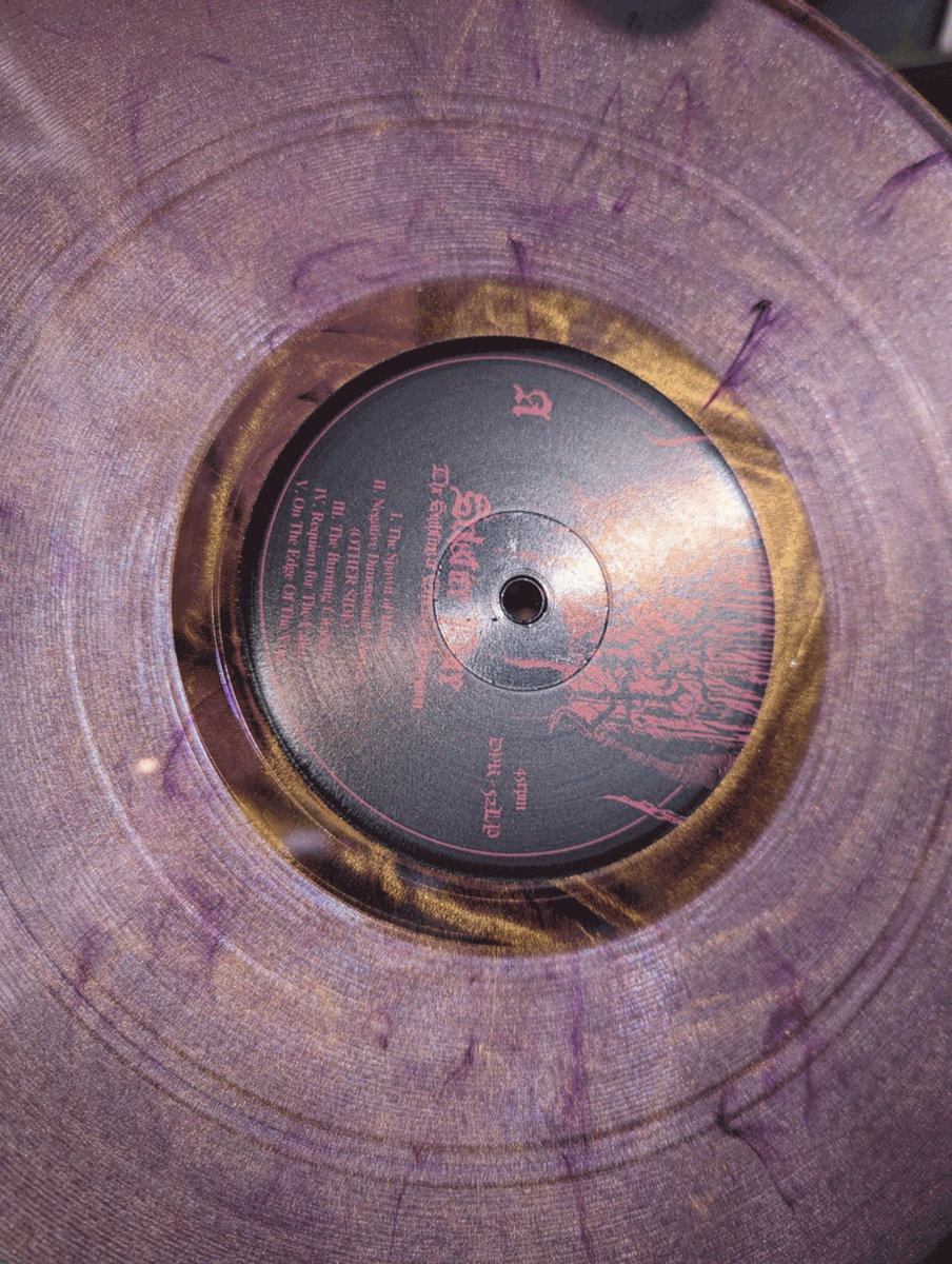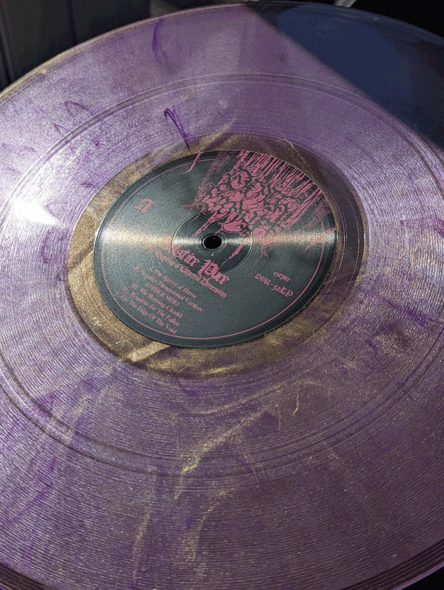 Vinil translúcido púrpura e dourado com selo preto e texto vermelho