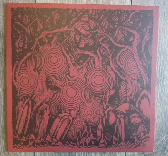 Capa de álbum vermelha com ilustração preta de pessoas cercadas por árvores e círculos