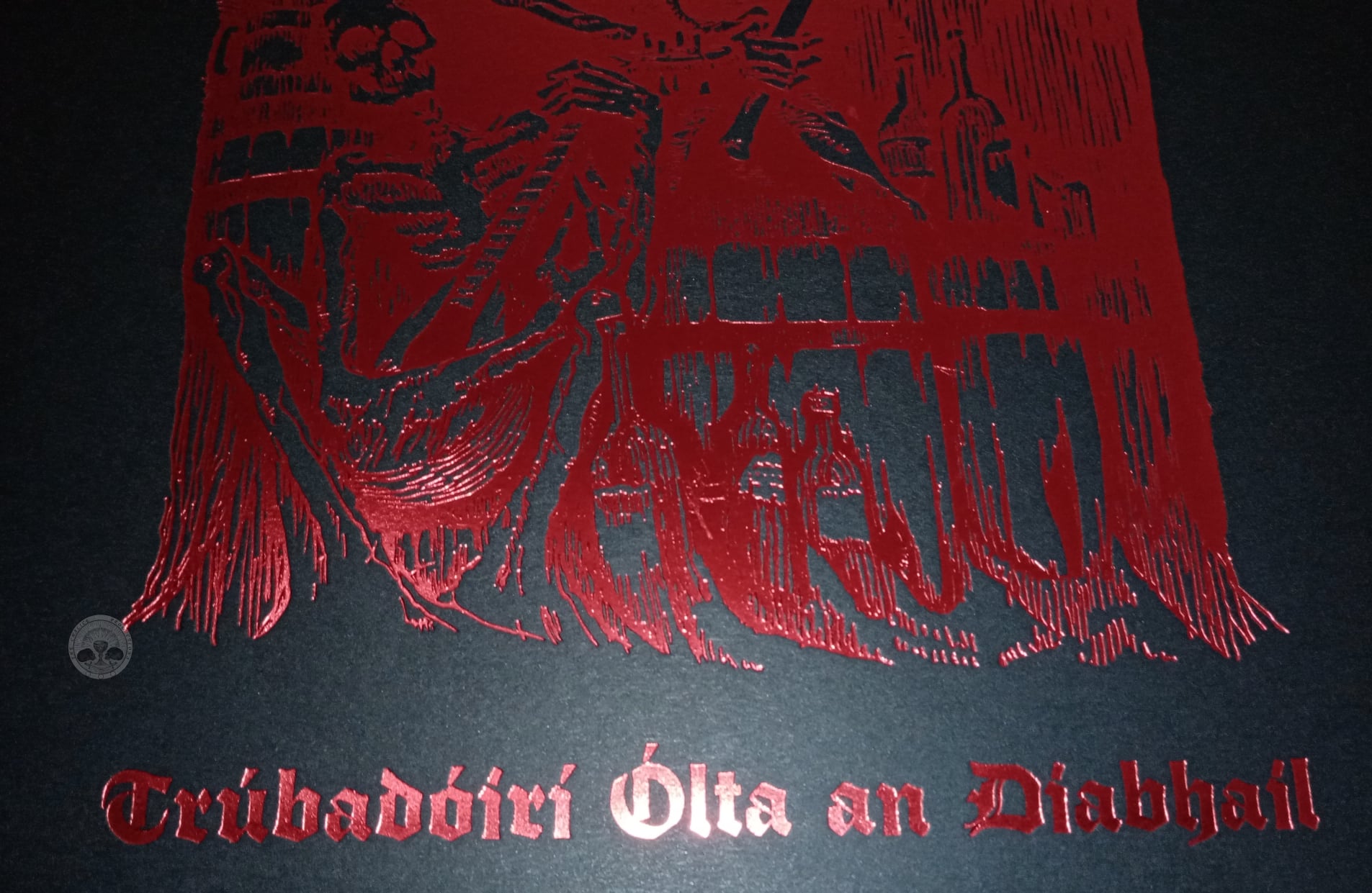 Estampa vermelha e preta com texto 'Crúbadoirí Olta an Diabhail' em fundo preto.