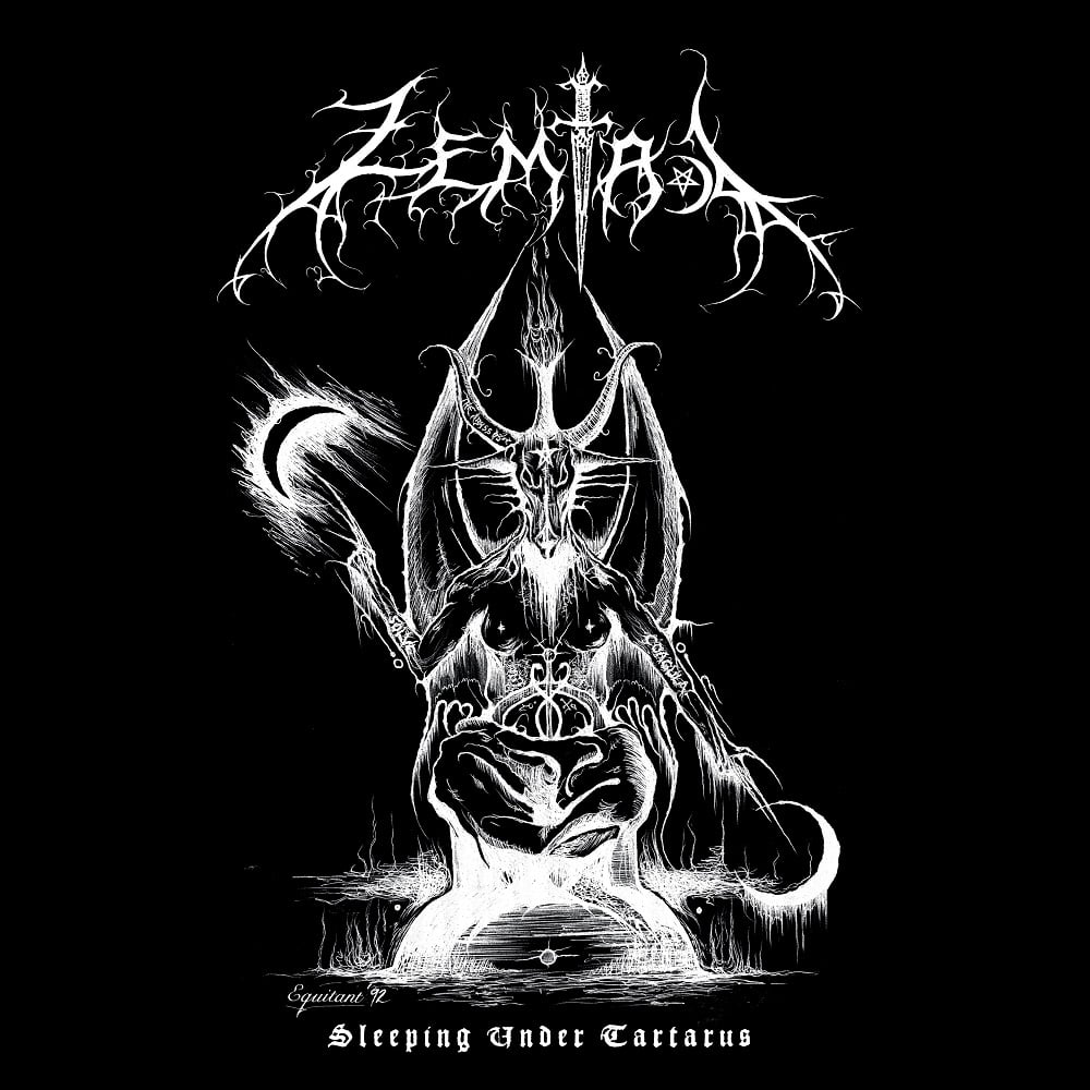 Figura demoníaca sentada num trono com chifres, asas e tocha, texto Zephthos e Sleepung Under Tartarus