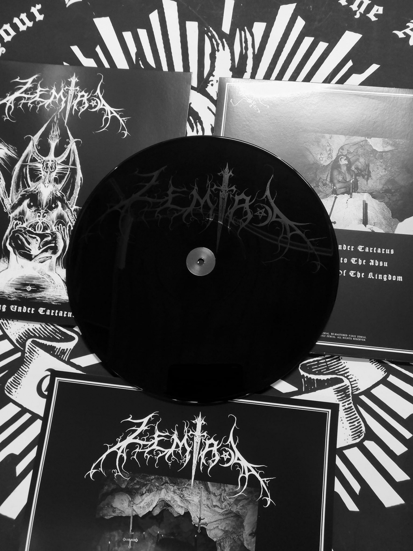 Vinil preto com logotipo Zephyrum e capas de álbuns preto e branco com arte e texto